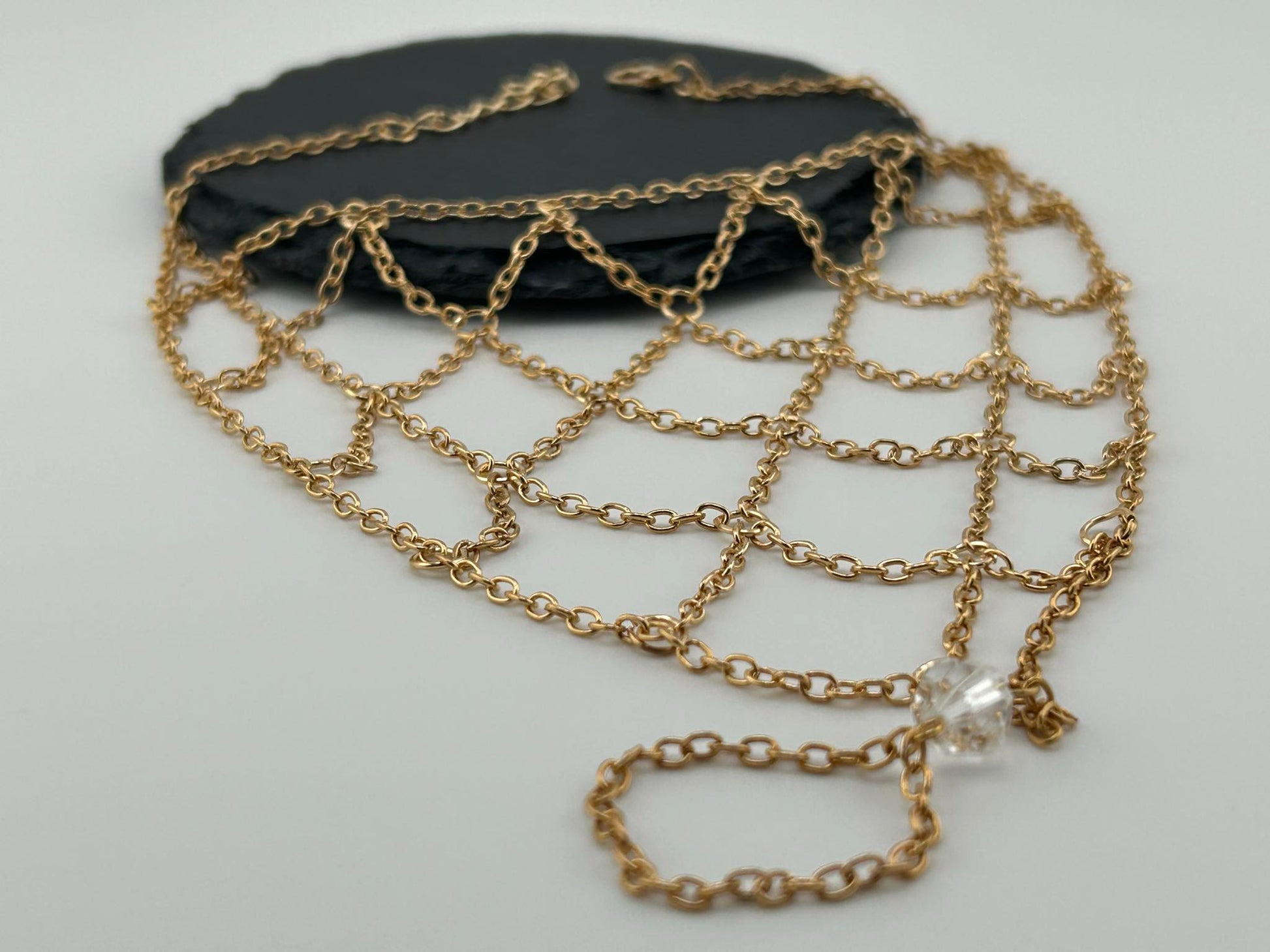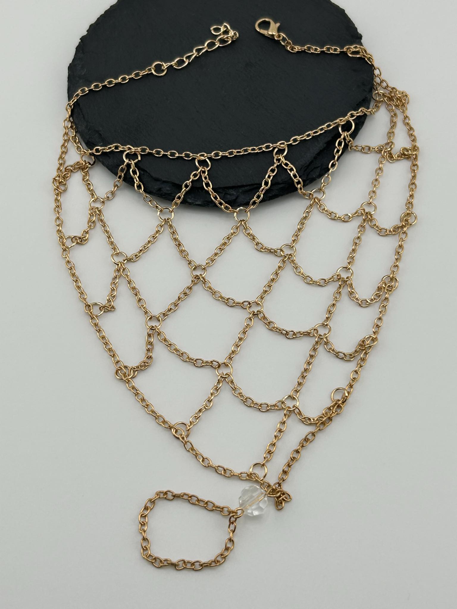 Tauchen Sie ein in die Welt des Luxus mit unserem Fischernetz Handketten Ring. Der Handkettenring besticht durch seine elegante Fischernetz Optik und verleiht Ihrem Look einen Hauch von Exklusivität. Lassen Sie sich verzaubern von diesem kunstvollen Accessoire, das Ihre Hand zur Visitenkarte der Schönheit macht.