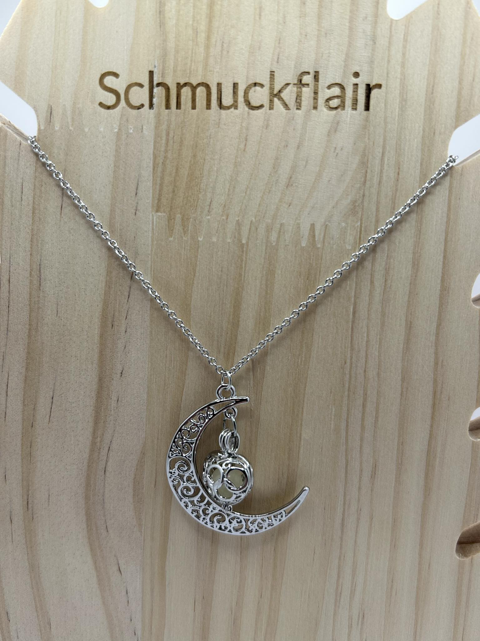 Leuchtende Mond-Anhänger Kette mit Herz – Floral Design, 45 cm, Silberfarben